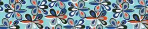 This modern design features abstract flowers in blues, greys, white and red on a light blue background.