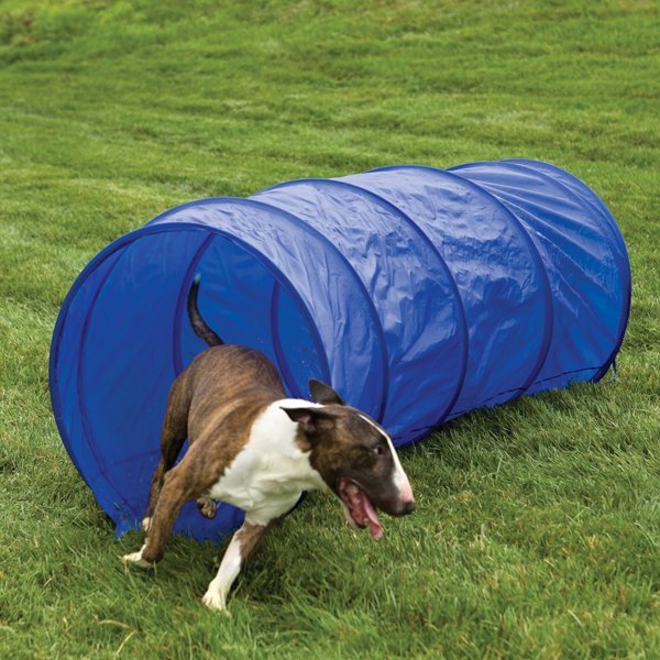 - Blue poly-nylon Open Tunnel measures 57"L x 24"D and features a stay-open spring metal frame that collapses for easy storage. Tunnel has side straps with metal grommets that let you stake it to the ground.