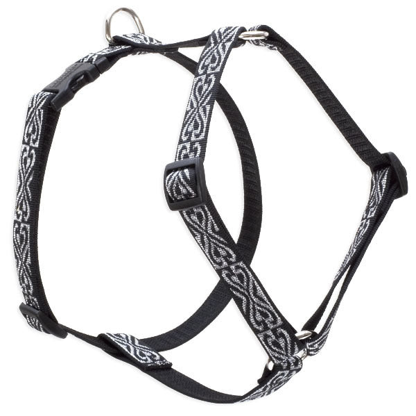 This 3/4 inch Roman-Style harness features adjustable shoulder straps and an extra-long sternum strap designed to fit a wide range of body types. Built to last with welded steel D and O-rings and a heavy-duty side release clasp on the adjustable girth. Matching leashes and collars are available.