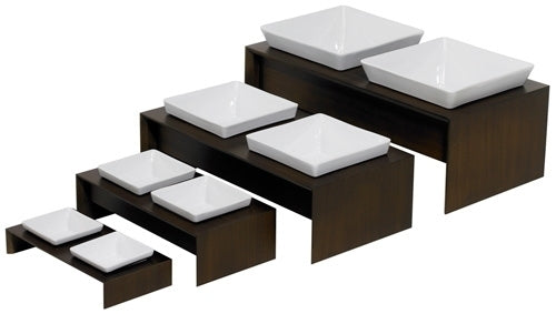 Pet dining has never been so refined. The simple, clean lines of the Meshidai Raised Pet Feeder create a contemporary, refined look. Available in two designer wood veneers, Mocha or Black with classic white, heavy-weight ceramic bowls (lead-free and dishwasher safe). Wood veneer stand is water repellent and easily wipes clean. All stands have anti-slip cushioned feet.