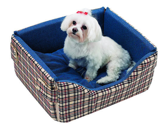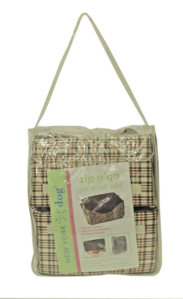 Each corner of the Zip N Go zips open allowing sides to fold in. This adorable dog bed features a removable pillow and attachable side securing straps. Made of soft, comfy polyester fabric. Tan check color is made of denim and polyester fabrics. Each bed comes packaged in a plastic zipper travel bag with shoulder strap.