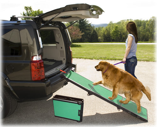 This easy to use dog ramp folds quickly and easily. It carries like a briefcase and can support animals up to 200 pounds and it only weights 22 pounds.