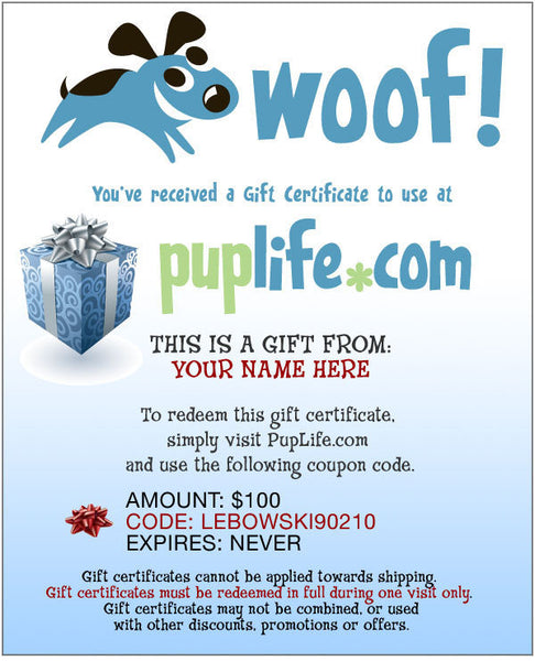 Best of all, PupLife orders over $100 (the gift certificate minimum) ship for free, so your PupLife Gift Certificate includes free shipping for the recipient.