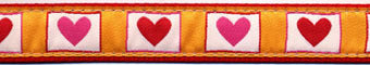 Love is in the air! Adorn your precious pup with our sweet ’n sassy Hot Hearts Dog Collar. These adorable dog collars and leashes are made in the USA with beautiful, custom-woven ribbon over durable, red nylon webbing.